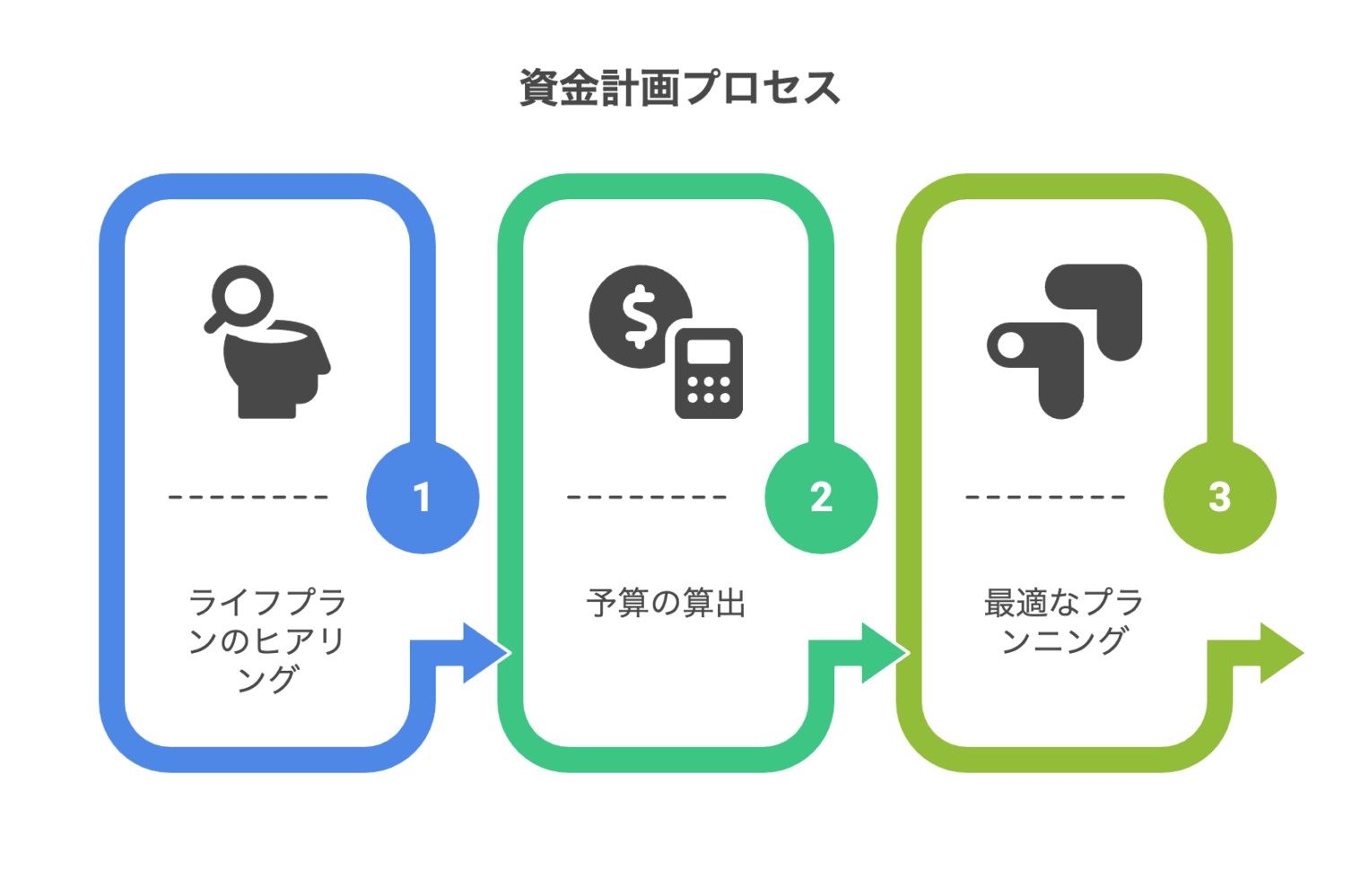 お客様の未来の暮らしまでを見据えた、最適な資金計画を3つのステップで一緒に考えます。
