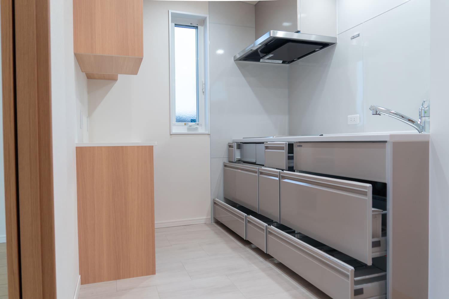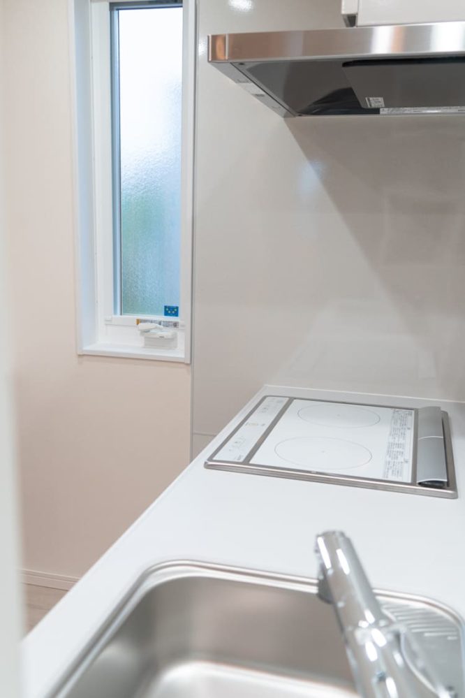縦長の窓から差し込む光が手元を明るく照らし、毎日の料理の時間を楽しく彩ります。