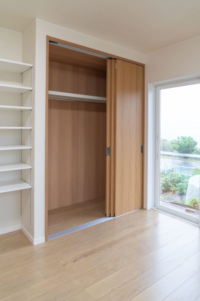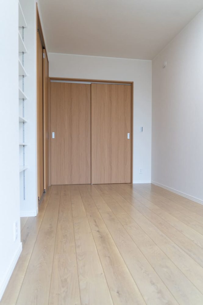 大きなクローゼットを備えた洋室は、白を基調としたシンプルなデザイン。