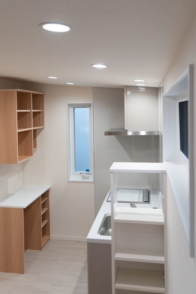 暗くなりがちだった台所は、限られたスペースを最大限に活かした、明るく機能的なキッチンへと変貌しました。