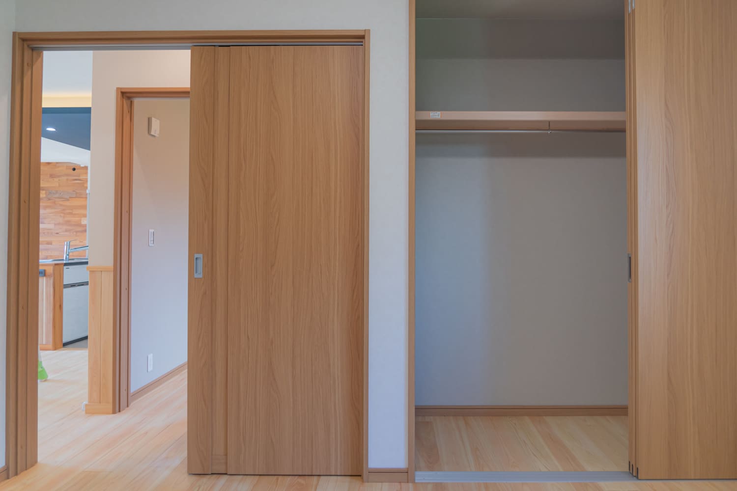 温かみのある木製ドアを開けると、美しい木目に包まれた、明るく広々とした空間が広がります。