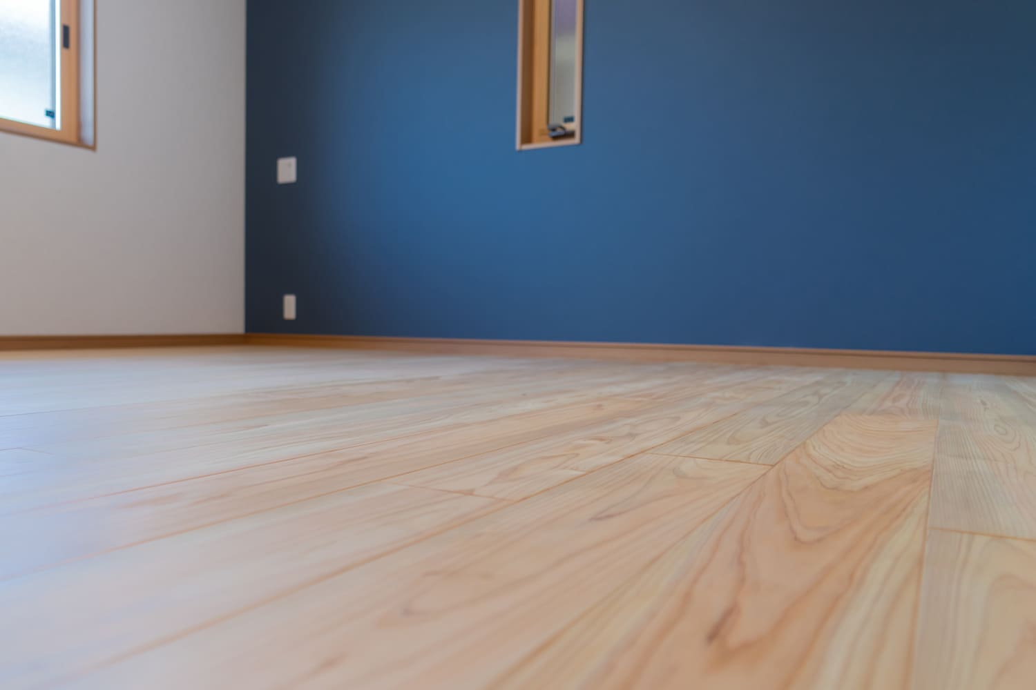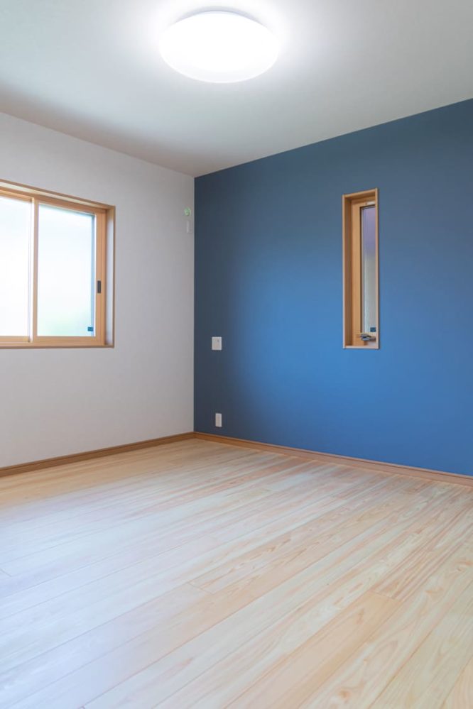明るい無垢材の床に、深みのあるネイビーのアクセントウォールが映える洋室。