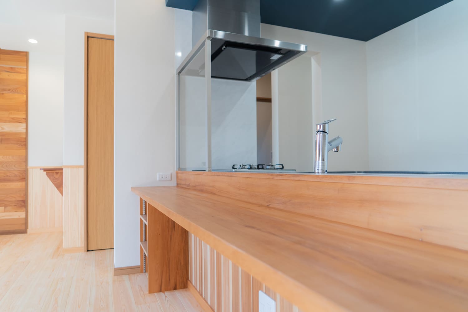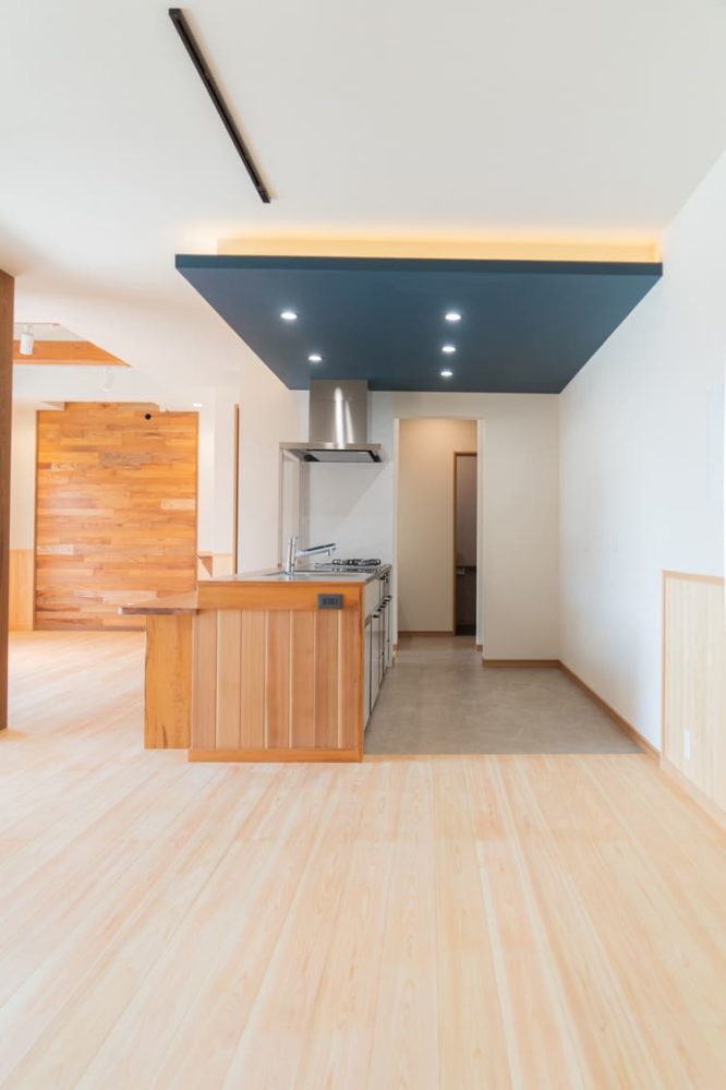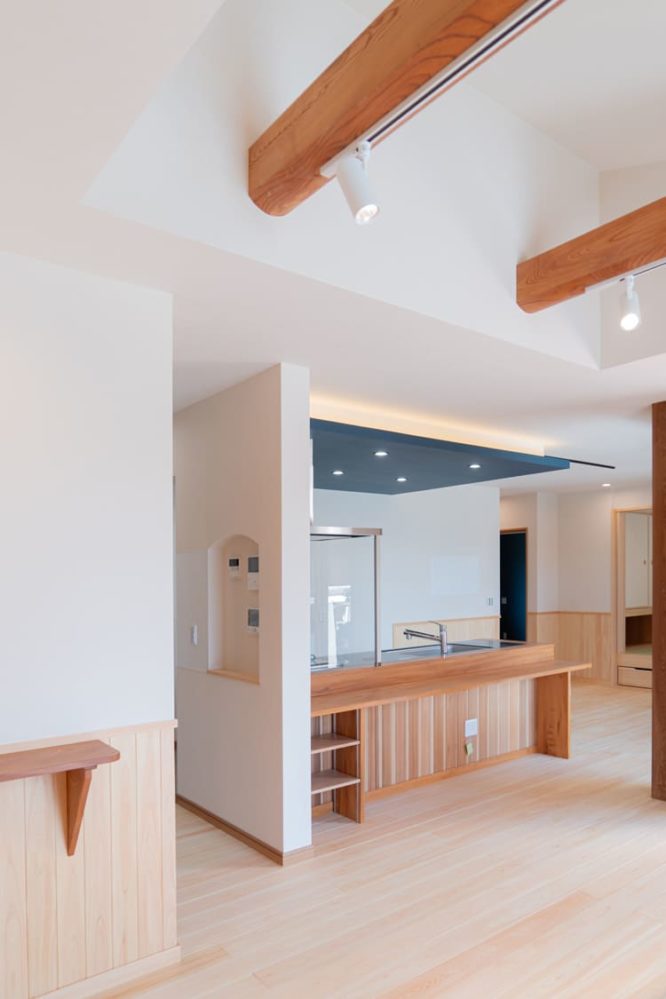 木の温もりと、落ち着いたネイビーの下がり天井のコントラストが美しい、まるでオーダーメイド家具のようなアイランドキッチン。