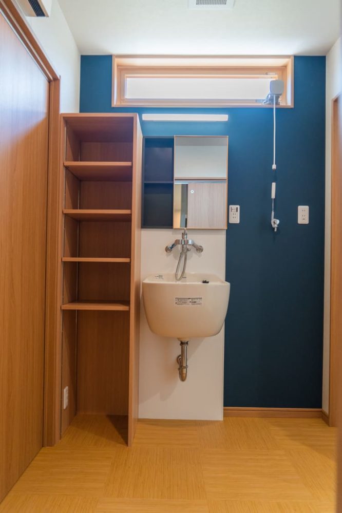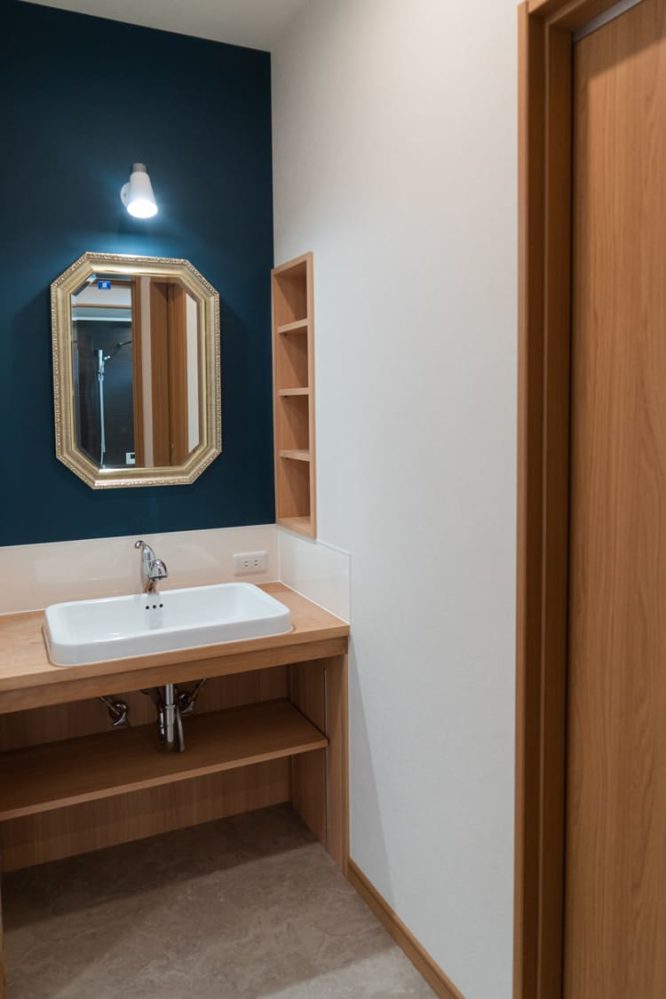 壁のニッチ(埋め込み棚)や鏡の横の棚など、使い勝手を考えた収納もたっぷり。