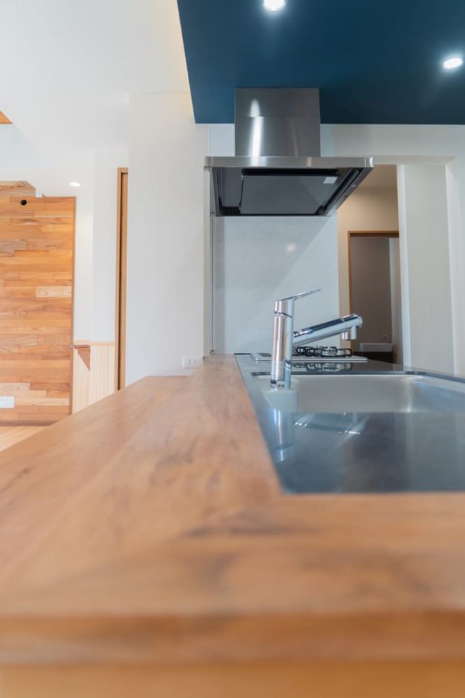 木の温もりが美しいアイランドキッチンは、まさに我が家の主役。 落ち着いたネイビーの下がり天井との組み合わせも格好良くて、友人が集まった時には「まるでお洒落なカフェみたい」と褒められます。